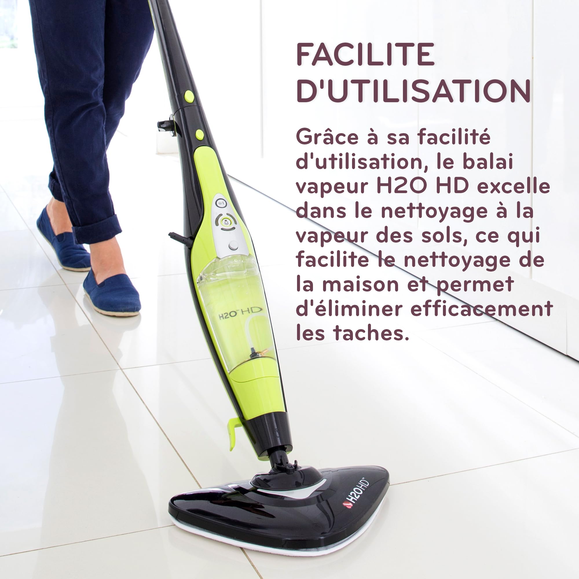 Le H2O HD est bien plus qu’un simple balai à vapeur ! Grâce à sa fonction 2 en 1, il se transforme instantanément en nettoyeur vapeur portable pour atteindre toutes les surfaces. Avec sa puissance de 1500W, il élimine 99,9% des bactéries, germes et virus en seulement 15 secondes ! 🦠